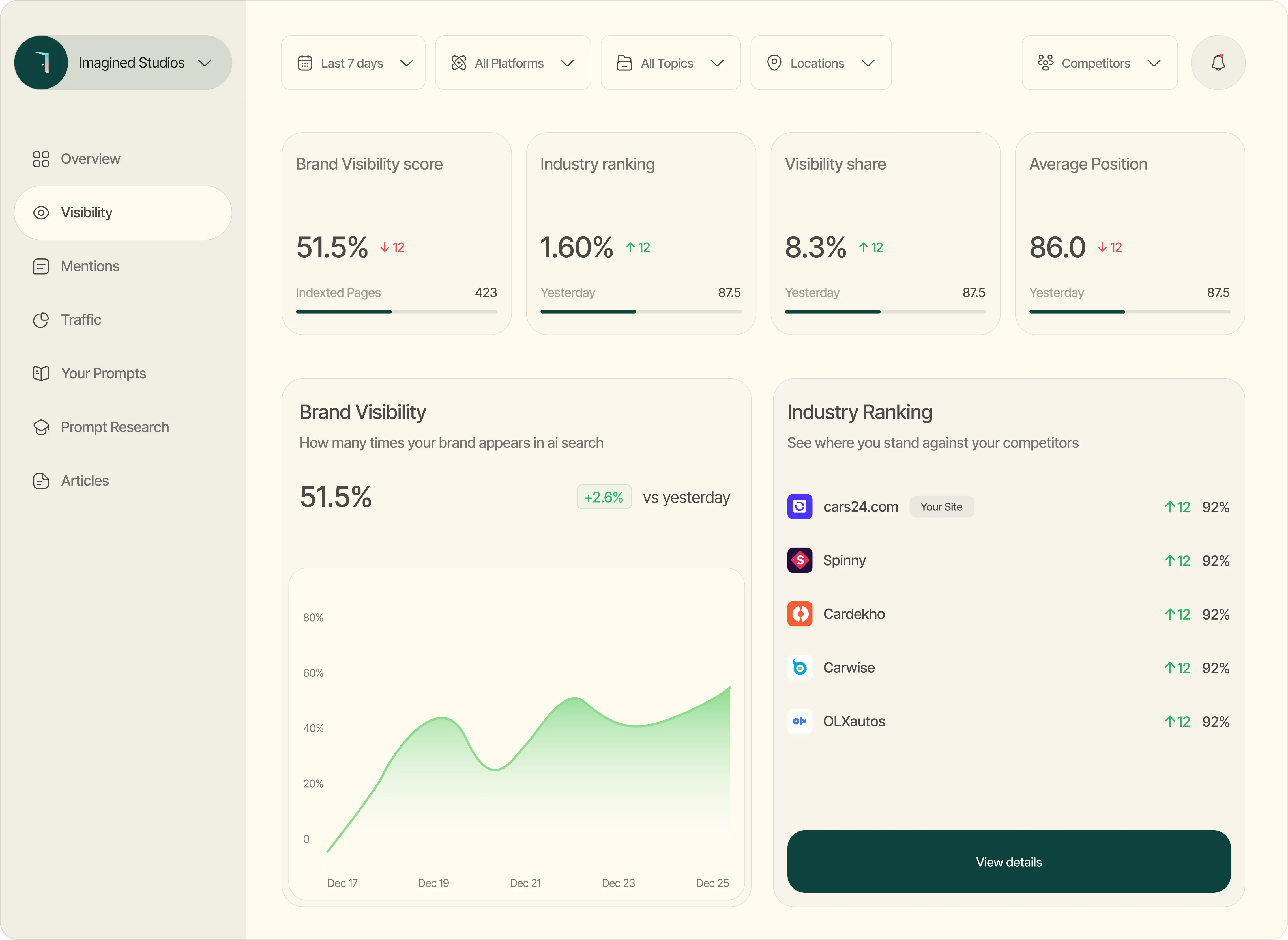 Connect GA4 and GSC to analyze how AI search drives real traffic & revenue. Track visibility metrics, share of voice, industry rankings and more, across every answer engine - all in one place.
